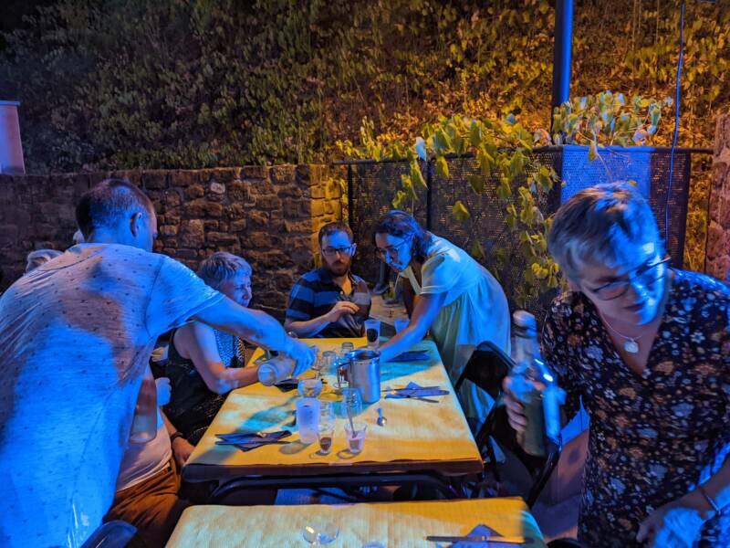 C'est à vingt heures que commençait l'apéritif concert pour deux heures de chansons françaises d'ambiance interprétées à la perfection par la formation Jyves venue de Villemoustaussou dans l'Aude. Alain Souchon, Michel Delpech, Joe Dassin, Francis Cabrel, Claude Nougaro , Téléphone, Patrick Bruel, Renaud, Eddy Mitchell, Jacques Dutronc et Johnny étaient au programme. Coca, Perrier, Bière pression et Kyr à la châtaigne étaient proposés aux participants par Marie-Andrée, Michel et Dédé, pour accompagner cet intermède musical.