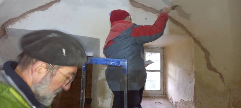 Betty, toujours aussi volontaire, achève le crépi à base de chaux de la chapelle du sacré cœur.