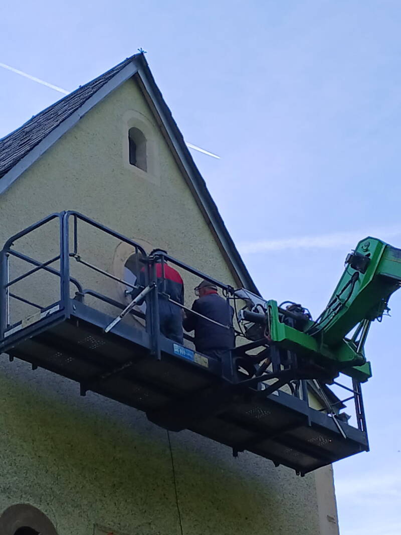 Grace à Thierry Gauhier et son monte charge, l'encadrement extérieur de l'Oculus a pu être restauré. Des travaux impressionnants !